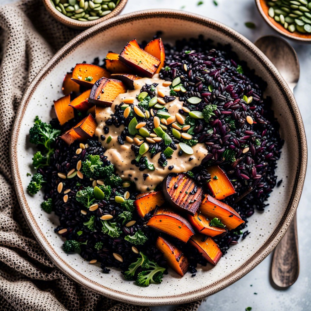 - Assemble bowls: layer quinoa and black rice, top with sweet potatoes, kale, avocado, and seeds.